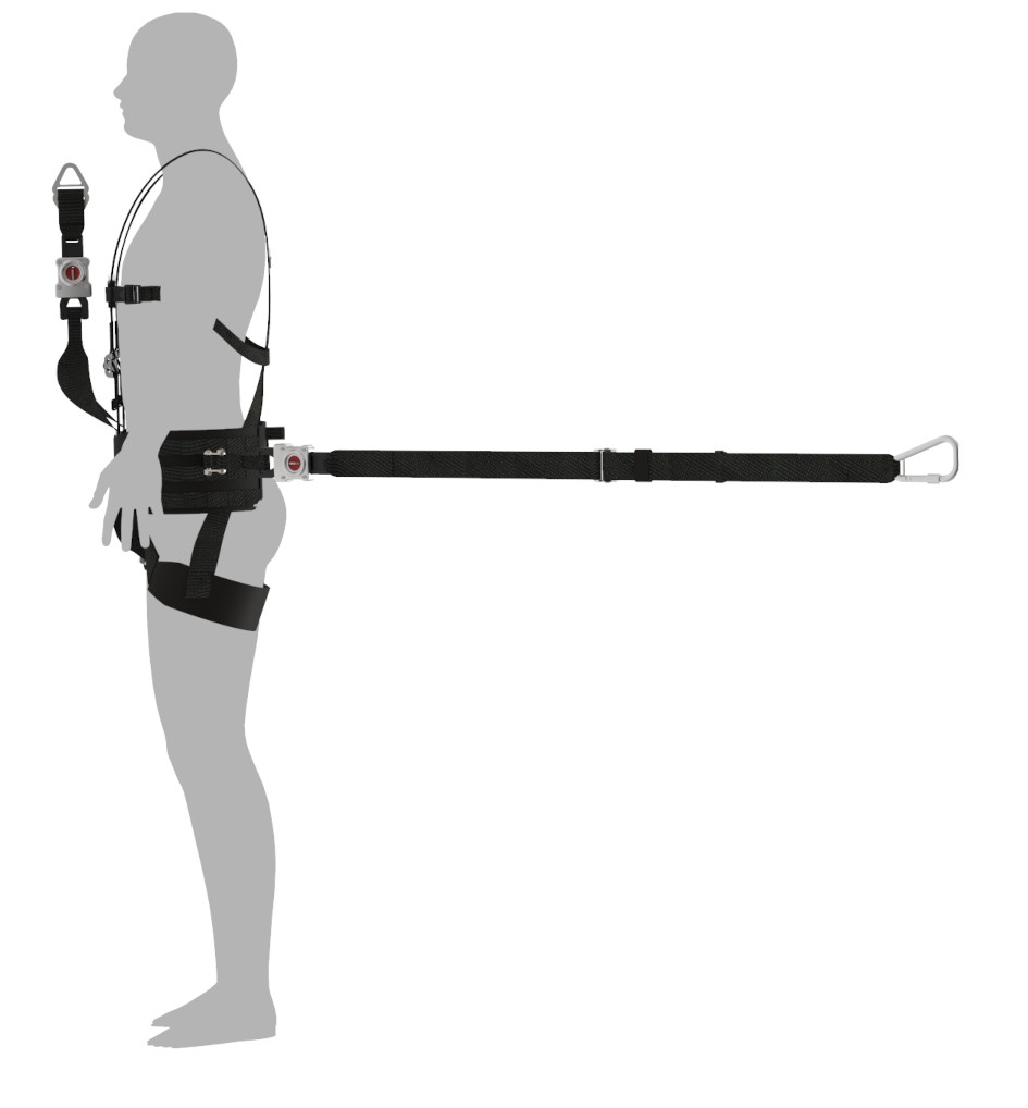 A continuación se describe el sistema completo de arnés y chaleco, el único arnés del mundo con liberación rápida y dispositivo de flotación integrado que ha recibido una aprobación reglamentaria de fabricación.